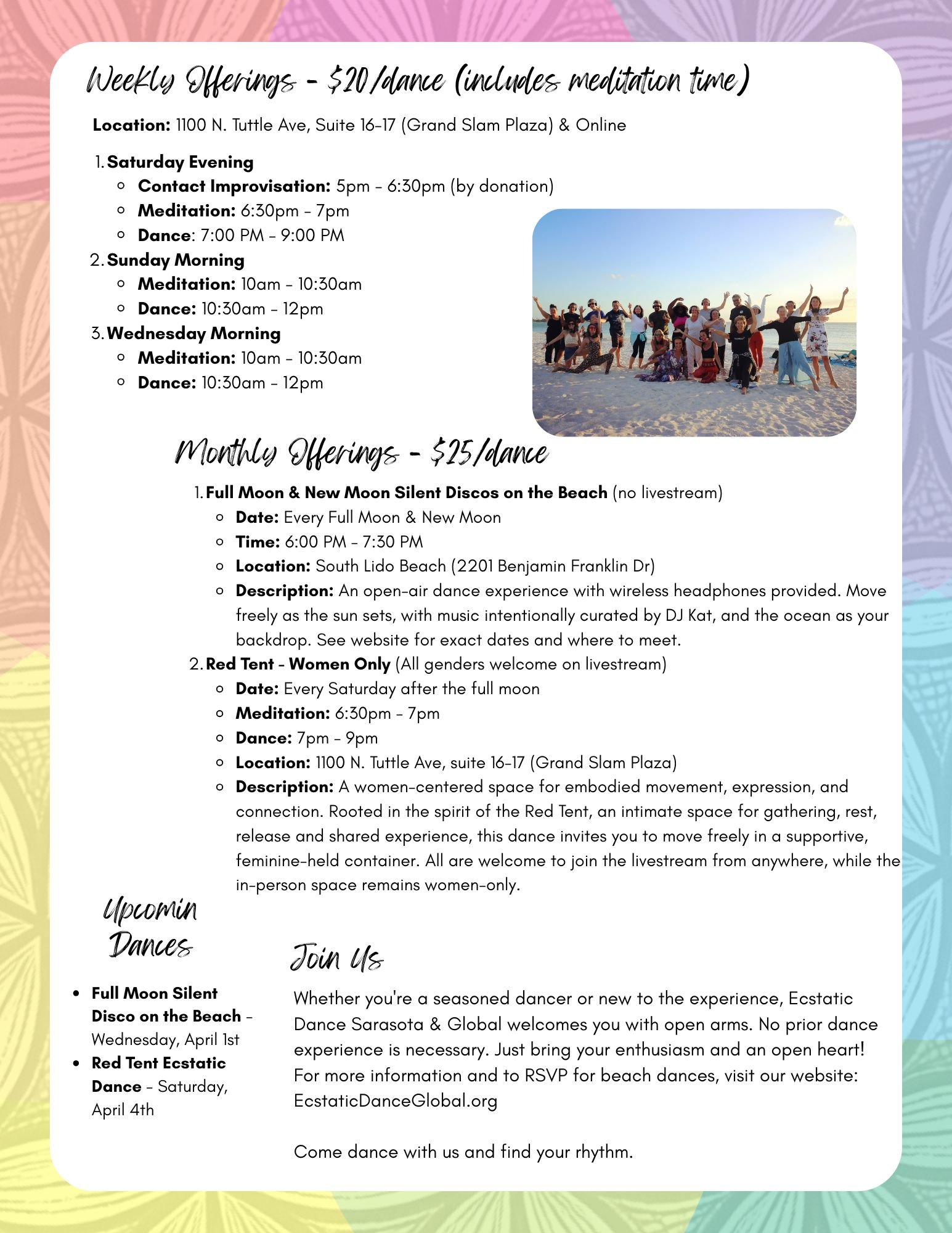 We started in Sarasota as the first Ecstatic Dance on the West coast of Florida in 2013. We’ve since grown and changed.
