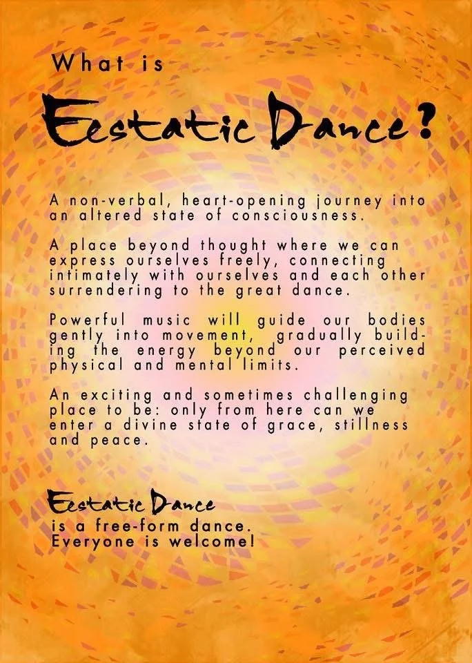 Wednesday morning Ecstatic Dance Doors open at 10am for meditation and 10:30-12pm for the dance.